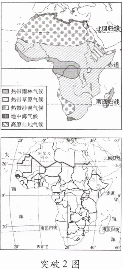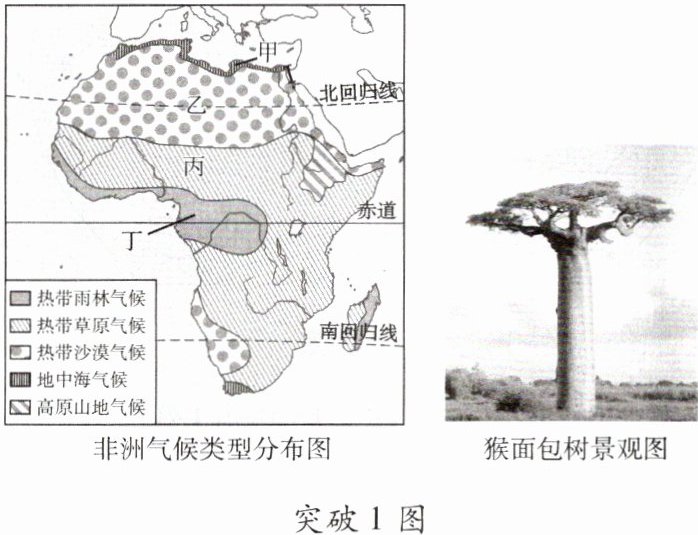 突破1][2023.滨州]猴面包树是非洲的−种热带落叶乔木,千季时为了减少水分蒸发,树叶脱落;湿季时利用粗大的身躯吸收并贮存水分,发芽开花。结合非洲气候类型分布图和猴面包树景观图,完成1~2题