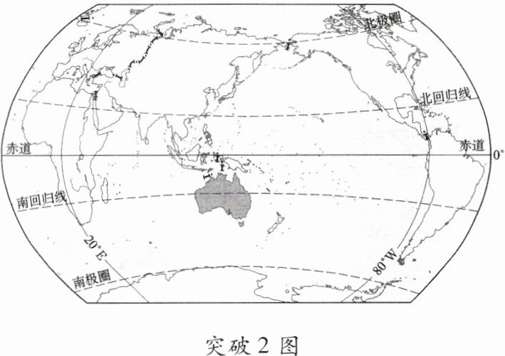 突破2[2024.河北]小明学习了区域地理后,认识到地理位置对区域特征形成的重要性。为更好地了解澳大利亚,小明查找到一幅世界海陆分布图(下图)进行学习。据此,完成1~2题