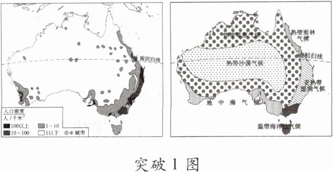 突破1[2024.定西]澳大利亚是世界上唯一独占一块大陆的国家。该大陆保留了很多古老而独特的物种。读澳大利亚人口分布图和气候分布图,完成1~2题。
