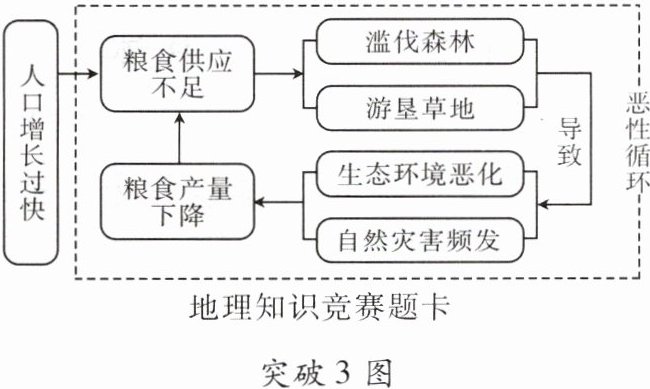 D 解析:由图可知,该地区由于人口增长过快,粮食供应不足,饥饿问题突出。由图可知,该地区人口增长迅速、粮食不足、生态恶化,描述的是撒哈拉以南的非洲,这里90%以上为黑色人种,有“黑种人的故乡”称号。该地区人地关系恶性循环的根本原因是人口增长过快,不是自然灾害频发。