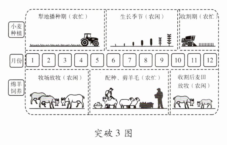 突破③[2024.山西]澳大利亚被称为“骑在羊背上的国家”。每年8~9月,很多牧场会举办剪羊毛比赛。如图示意澳大利亚某地的绵羊一小麦混合经营农事安排。据此,完成1~2题。