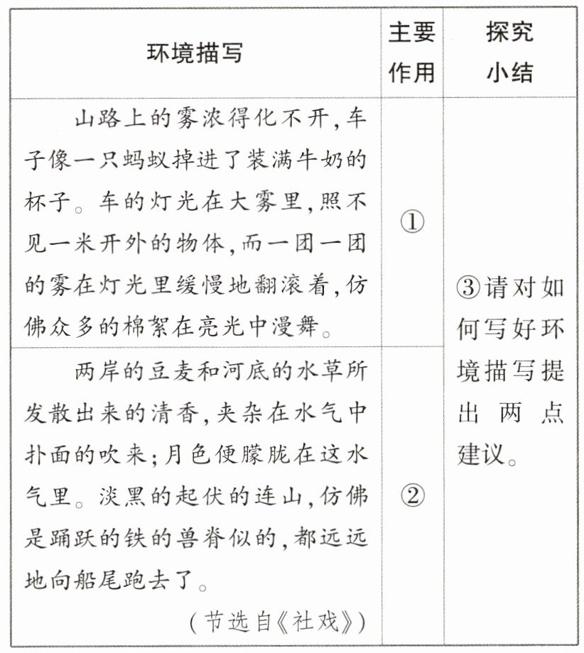 ②运用多感官描写的手法,展现了一幅江南水乡特有的清新优美的月下夜景图,描写“连山”时化静为动,突出了船行速度之快,烘托了“我”想看戏的愉快、急切的心情。