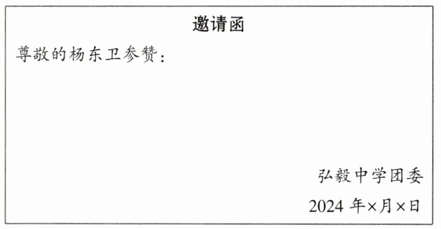 (1)弘毅中学团委计划举办一场报告会,报告人为杨东卫参赞,参会人员为九年级学生。请给他写一封邀请函。