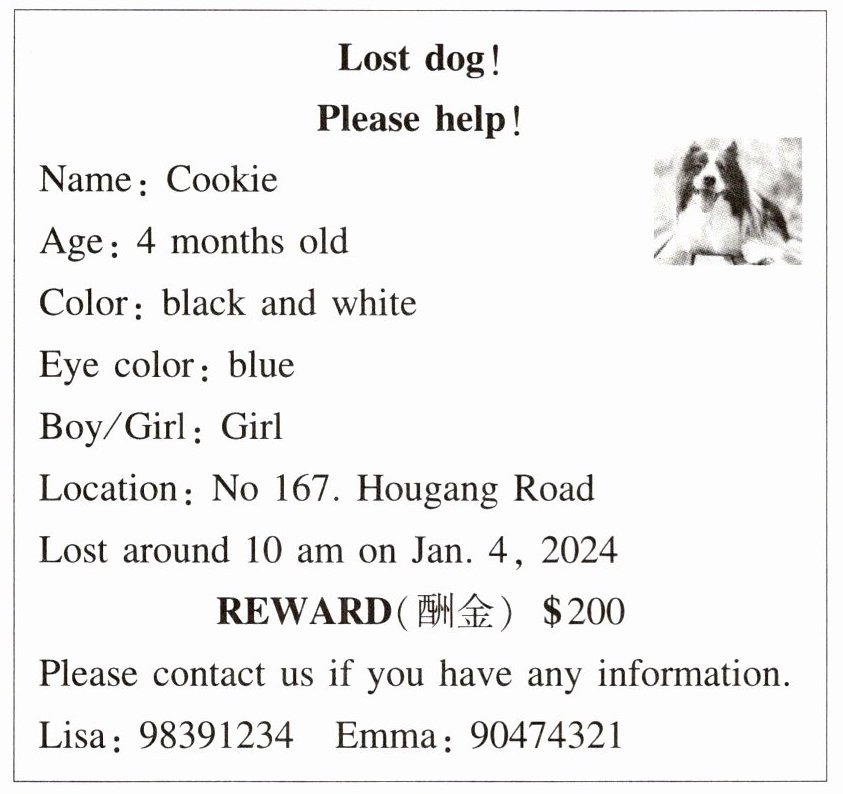 (一)(主旨大意)本文是一篇寻狗启事。1.D 2.A 3.C