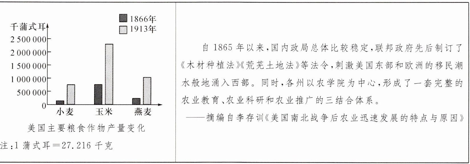 (1)名称:美国内战(或美国南北战争)。(1分)影响:①维护了国家统一(或避免了国家的分裂);②废除了奴隶制,清除了资本主义发展的最大障碍;③促进了美国资本主义经济的迅速发展;④增强了人民的国家认同感和凝聚力;⑤并未完全消除种族歧视。(任答三点即可,3分)(2)发展状况:美国主要粮食作物产量迅猛增长。(2分)主要因素:①国内政局稳定;②政府制订了适宜农业发展的法令;③大量的移民涌入;④政府重视农业教育和农业科研,大力培养农业技术人才。(任答两点即可,4分)(3)①国家统一促进社会发展;②国家稳定是经济繁荣的前提;等等。(任答一点即可,2分)