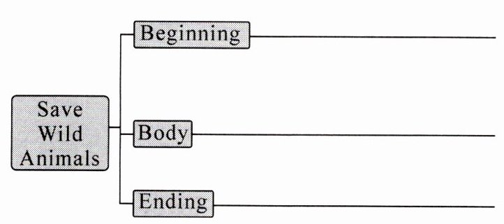 议论文@@三@@一般现在时@@简要介绍野生动物的现状,分析其数量减少的原因@@谈谈保护野生动物的重要性,并提出保护的方法@@呼吁大家一起行动来保护野生动物@@many wild animals are facing the danger of dying out@@reasons why animals are dying out and some measures to protect them@@call on people to protect wild animals@@More and more wild animals are in great danger for many reasons. For one reason, fresh air and clean water are polluted so that the environment which animals live in is destroyed. For another, since many trees are cut down, many animals lose their homes and they don’t have enough food to eat. What’s worse, many animals are killed for money.@@There is no doubt that every animal helps to keep the balance in nature. So we must save wild animals. On the one hand, we should make rules on animal protection and everyone should follow them. On the other hand, we should stop putting rubbish into the sea.@@Animals are not only our friends, but also the priceless natural resources. Protecting and saving animals can make us share a blue sky. So let’s take action to protect animals.