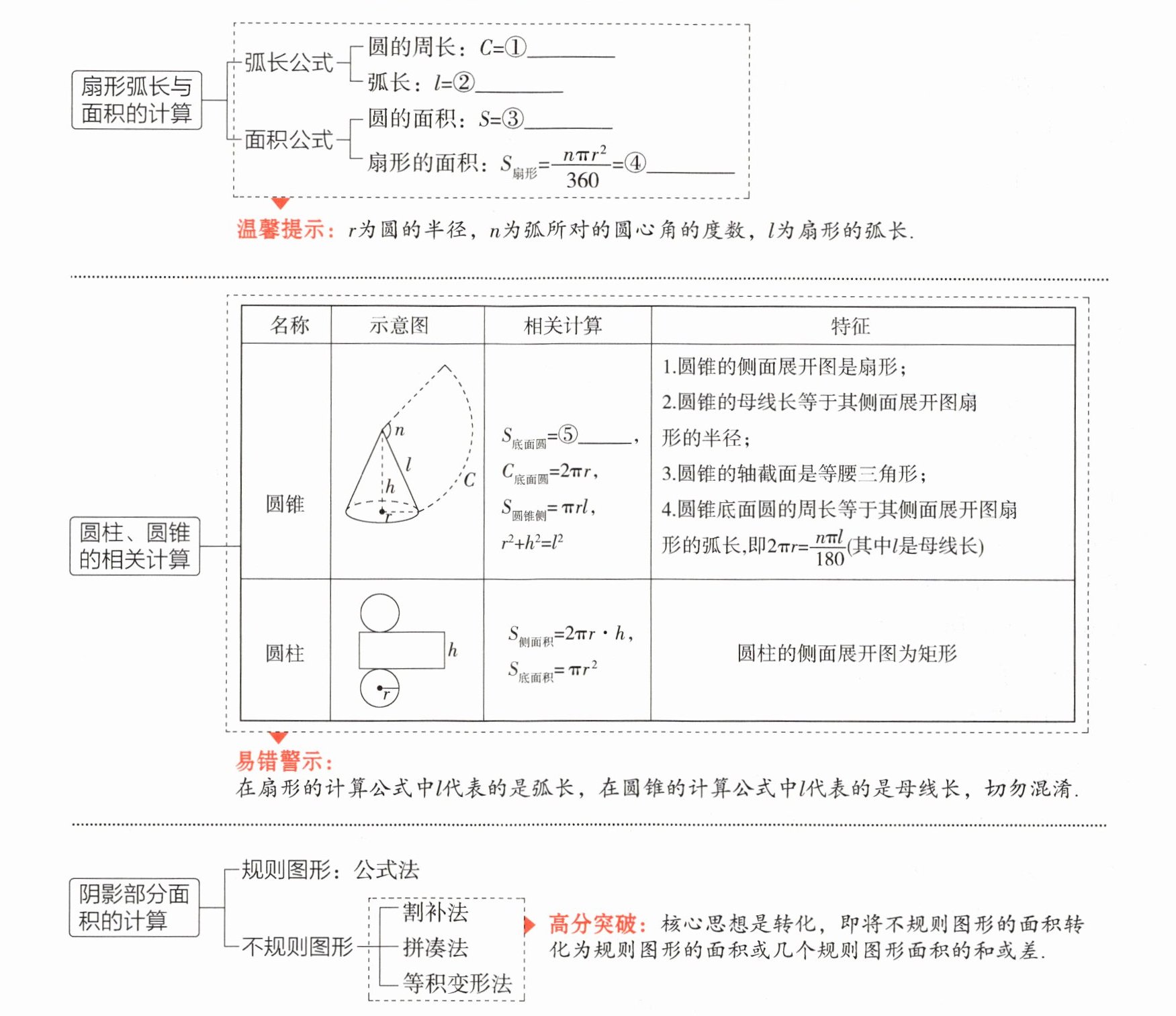 答案 ①$2\pi r$ ②$\frac{n\pi r}{180^{\circ}}$ ③$\pi r^{2}$ ④$\frac{1}{2}lr$ ⑤$\pi r^{2}$