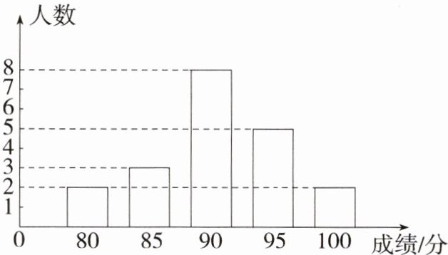 平均数为$\overline{x}=(80\times2 + 85\times3 + 90\times8 + 95\times5 + 100\times2)\div20 = 90.5$(分).