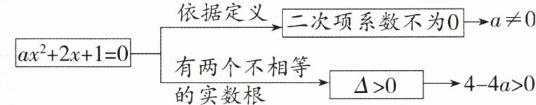 例3 若一元二次方程$ax^2 + 2x + 1 = 0$有两个不相等的实数根,则实数$a$的取值范围是 ( )