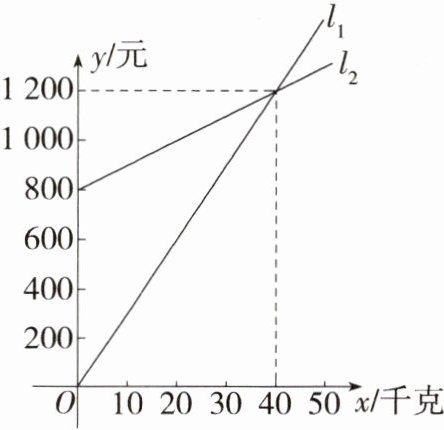 解析 根据题图可知直线$l_1$经过点$(0,0)$和点$(40,1200)$,设$y_1$与$x$的函数解析式为$y_1 = k_1x(k_1\neq0)$,则$1200 = 40k_1$,解得$k_1 = 30$,$\therefore y_1$与$x$的函数解析式为$y_1 = 30x(x\geq0)$。设$y_2$与$x$的函数解析式为$y_2 = k_2x + b(k_2\neq0)$,由直线$l_2$经过点$(0,800)$,$(40,1200)$,得$\begin{cases}800 = b\\1200 = 40k_2 + b\end{cases}$,解得$\begin{cases}k_2 = 10\\b = 800\end{cases}$,$\therefore y_2$与$x$的函数解析式为$y_2 = 10x + 800(x\geq0)$。