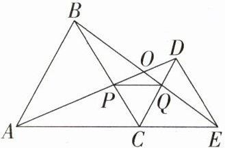 解题思路:通过等边三角形的性质等可证△ACD≌△BCE,进而∠AOB = ∠ACB;通过证明△ACP≌△BCQ,可得AP=BQ;利用全等三角形的性质可得∠BCD=60°,进而证明PQ//AE以及DE≠DP.
