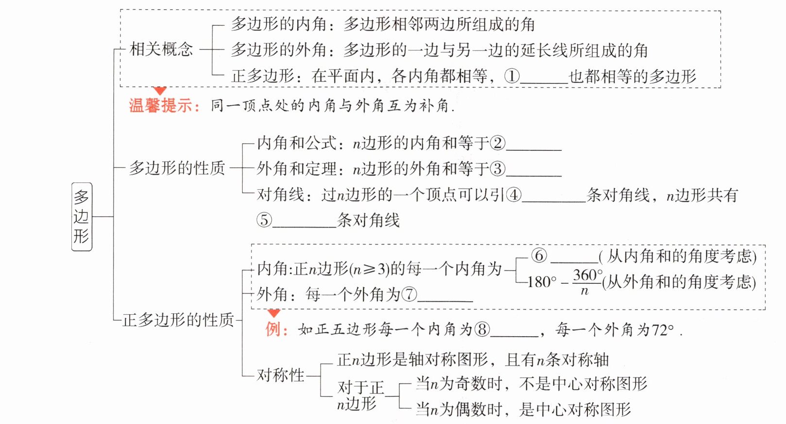@@答案 ⑥$\frac{(n - 2)\times180^{\circ}}{n}$ ⑦$\frac{360^{\circ}}{n}$ ⑧$108^{\circ}$