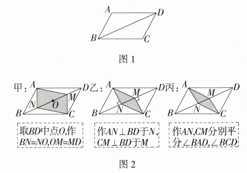 例2 如图1,▱ABCD中,AD>AB,∠ABC为锐角,要在对角线BD上找点N,M,使四边形ANCM为平行四边形,现有图2中的甲、乙、丙三种方案,则正确的方案是 ( )
