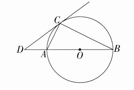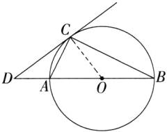解题思路 连接OC,根据圆周角定理得到$\angle ACB = 90^{\circ}$,根据等量代换得到$\angle DCO = 90^{\circ}$,即可证明DC是$\odot O$的切线。