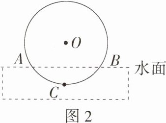 变式2 筒车是我国古代发明的一种水利灌溉工具,明朝科学家徐光启在《农政全书》中用图画描绘了筒车的工作原理,如图1。筒车盛水桶的运行轨道是以轴心O为圆心的圆,如图2。已知圆心O在水面上方,且$\odot O$被水面截得的弦AB长为6米,$\odot O$半径长为4米。若点C为运行轨道的最低点,则点C到弦AB所在直线的距离是( )