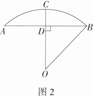 例1 石拱桥是我国古代人民勤劳和智慧的结晶(如图1),隋代建造的赵州桥距今约有1400年历史,是我国古代石拱桥的代表。图2是根据某石拱桥的实物图画出的几何图形,桥的主桥拱是圆弧形,表示为$\overset{\frown}{AB}$。桥的跨度(弧所对的弦长)$AB = 26$m,设$\overset{\frown}{AB}$所在圆的圆心为O,半径$OC\perp AB$,垂足为D。拱高(弧的中点到弦的距离)$CD = 5$m。连接OB。