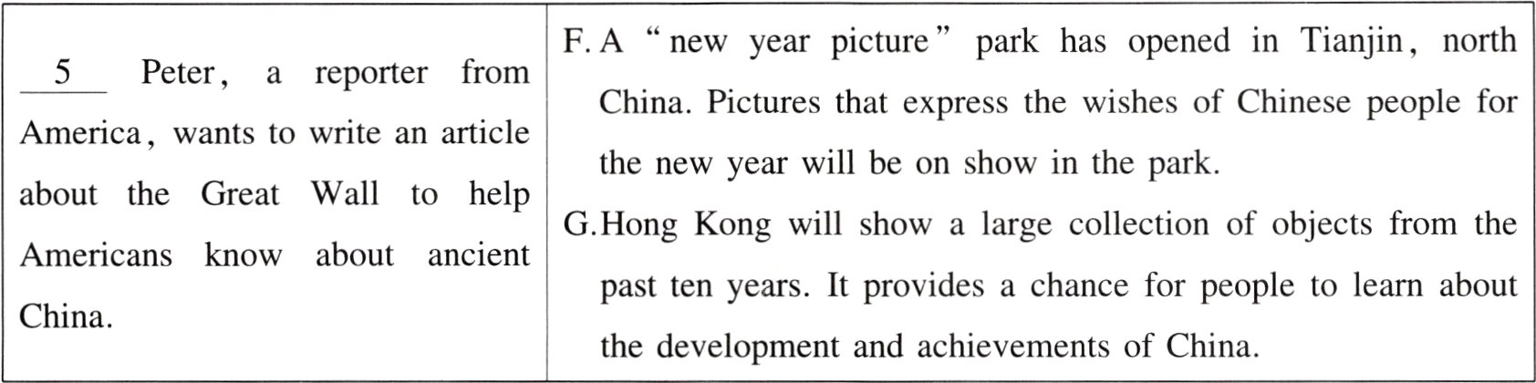 5.D 根据“Peter, a reporter from America, wants to write an article about the Great Wall to help Americans know about ancient China.”可知,彼得想了解长城,选项D“位于新疆的丝绸之路·长城文化博物馆收藏了600多件(组)文物和212处长城遗迹,展示了丝绸之路和长城的历史”与之对应,故选D。
