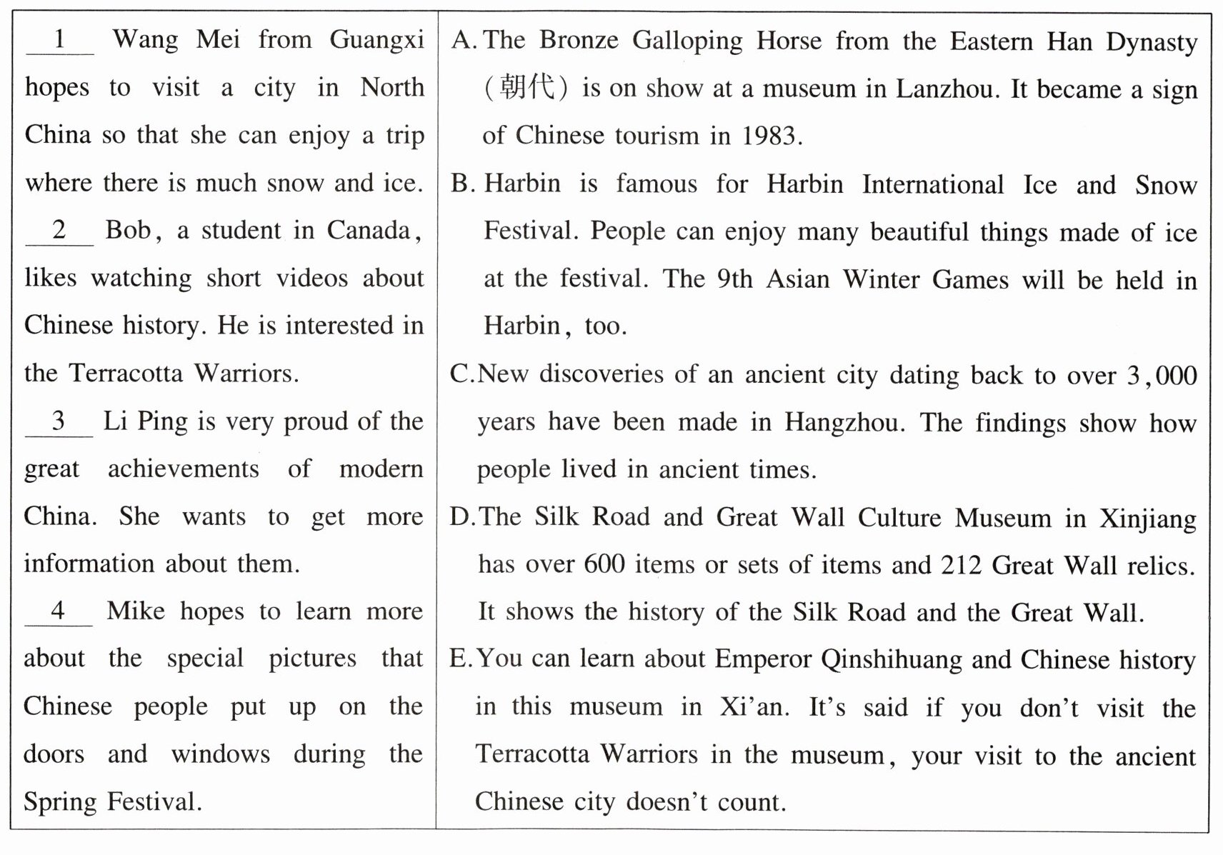 1.B 根据“Wang Mei from Guangxi hopes to visit a city in North China so that she can enjoy a trip where there is much snow and ice.”可知,王梅想要去中国北方的城市享受冰雪之旅,选项B“哈尔滨以哈尔滨国际冰雪节而闻名。在这个节日里,人们可以欣赏到许多美丽的冰制品。第九届亚洲冬季运动会也将在哈尔滨举行”与之对应,故选B。