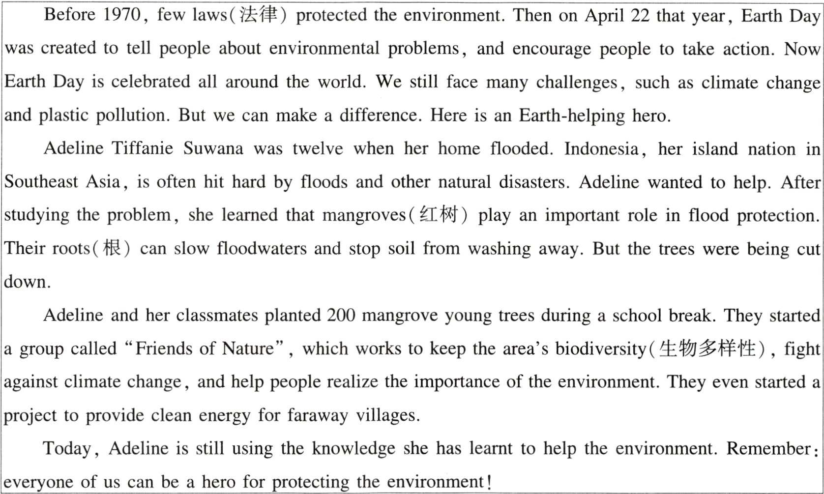 语篇解读 本文是一篇记叙文,讲述了印度尼西亚女孩阿德琳和同学一起种植红树林,甚至成立环保组织“自然之友”,来保护家乡环境的故事。1. It was created on April 22,1970./On April 22, 1970.根据第一段第一、二句可知答案。2. It/Her/Adeline's home flooded(when she was twelve).根据第二段第一句可知答案。3. Their/Mangroves’ roots can slow floodwaters and stop soil from washing away. 根据第二段倒数第二句可知答案。4. Adeline and her classmates (started a group called “Friends of Nature”). 根据第三段第一、二句可知答案。5. They/Adeline and her classmates provided clean energy for faraway villages./Faraway villages. 根据第三段最后一句可知答案。