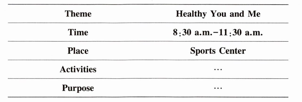 First of all, I want you to know that the theme of this activity is "Healthy you and me". The purpose is to encourage people to take part in voluntary work to protect the environment, making our city a more beautiful place to live in. Our task is to clean the Sports Center. We will set out at 8:30 next Saturday morning and the work is expected to be finished at 11:30. I'm sure you will like the voluntary work because you can make many new friends in this activity.