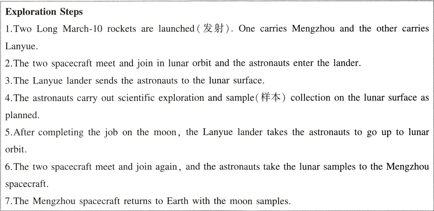 2.B 细节理解题。从探月步骤中的第2、3条可知,两个航天器在环月轨道上交会对接,宇航员进入“揽月”,“揽月”再把宇航员送到月球表面。再根据第5步,完成任务后,宇航员再次被“揽月”送回环月轨道,所以选择B。