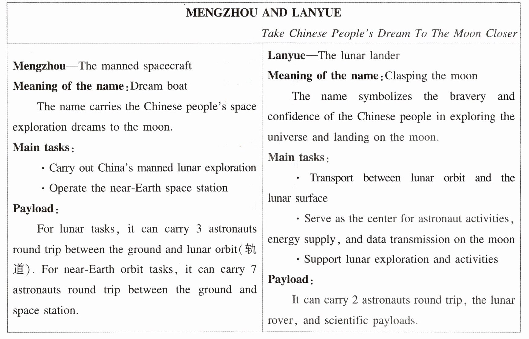 语篇解读,本文是以表格形式呈现的说明文,介绍了中国将在2030年左右将宇航员送上月球,分别由载人飞船“梦舟”和月面着陆器“揽月”执行任务。文章分别介绍了两艘航天器名称的由来、开展的任务、运载能力以及具体的探月步骤。