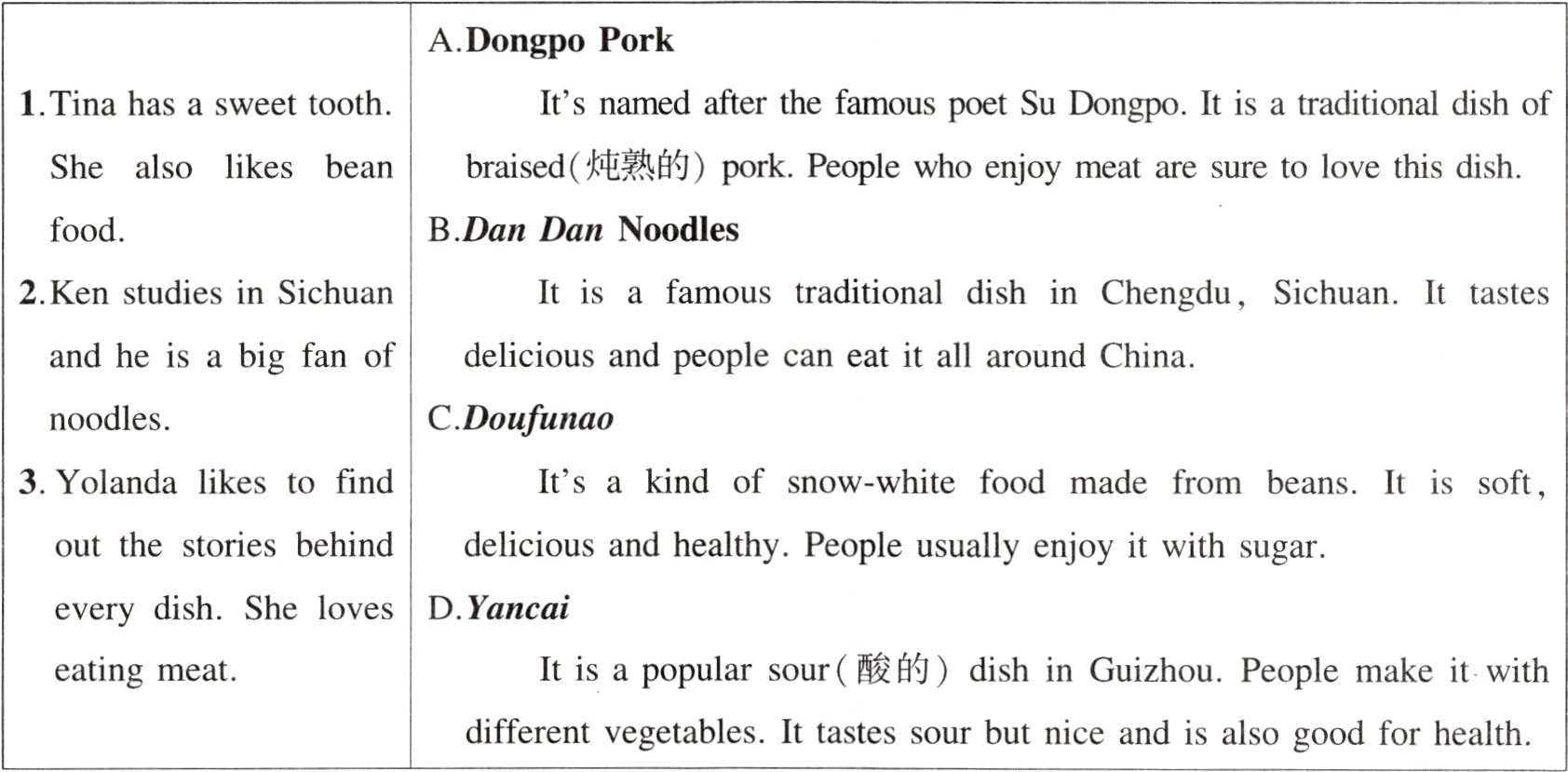 3.A 左栏说Yolanda喜欢弄清楚每道菜背后的故事,并且喜欢吃肉。选项A中的关键信息“It’s named after the famous poet Su Dongpo.”和“People who enjoy meat are sure to love this dish.”与之对应,故选A。