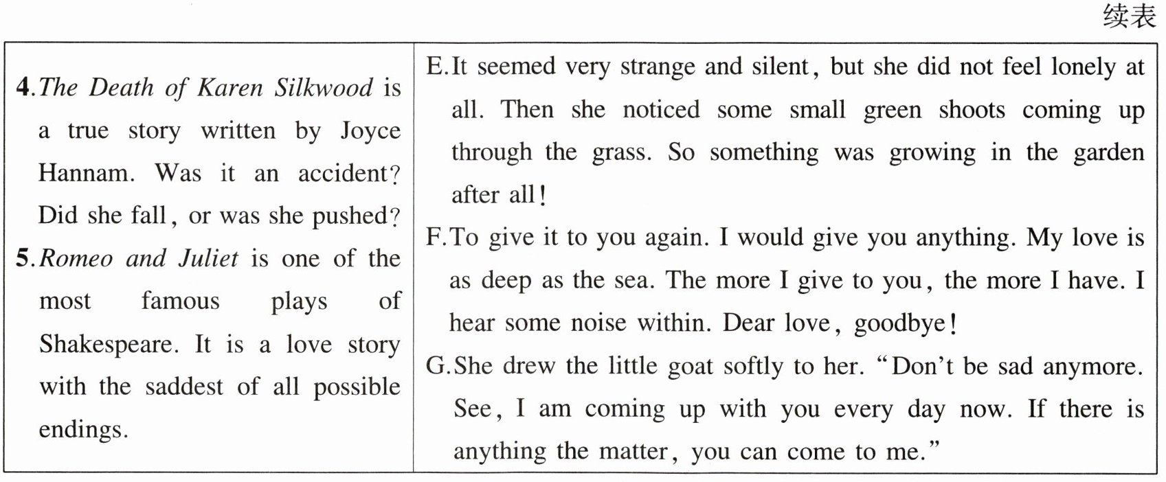 3.E 本题中的关键信息点The Secret Garden与选项E中的green shoots,the grass,the garden相对应,故选E。