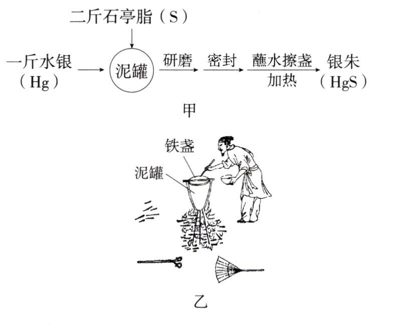 一斤水银(Hg)→泥罐→研磨、密封→蘸水擦盏、加热→银朱(HgS)