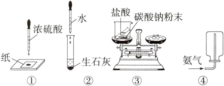 A 浓硫酸具有腐蚀性,能夺取物质中的氢元素和氧元素,按水的组成比脱去,生成黑色的炭,故浓硫酸能腐蚀纸,使纸变黑,故A正确;生石灰与水反应生成熟石灰,该过程产生大量热,属于化学变化,故B错误;盐酸与碳酸钠粉末在敞口容器中反应,造成产生的二氧化碳气体逸出,使反应后烧杯中剩余物质的质量减小,并非不符合质量守恒定律,故C错误;用向下排空气法收集氨气,说明氨气密度比空气小,故D错误。