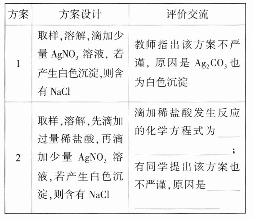 (2)【方案优化】将稀盐酸改为稀硝酸,既除去了碳酸根离子,又不会干扰NaCl的检验。
