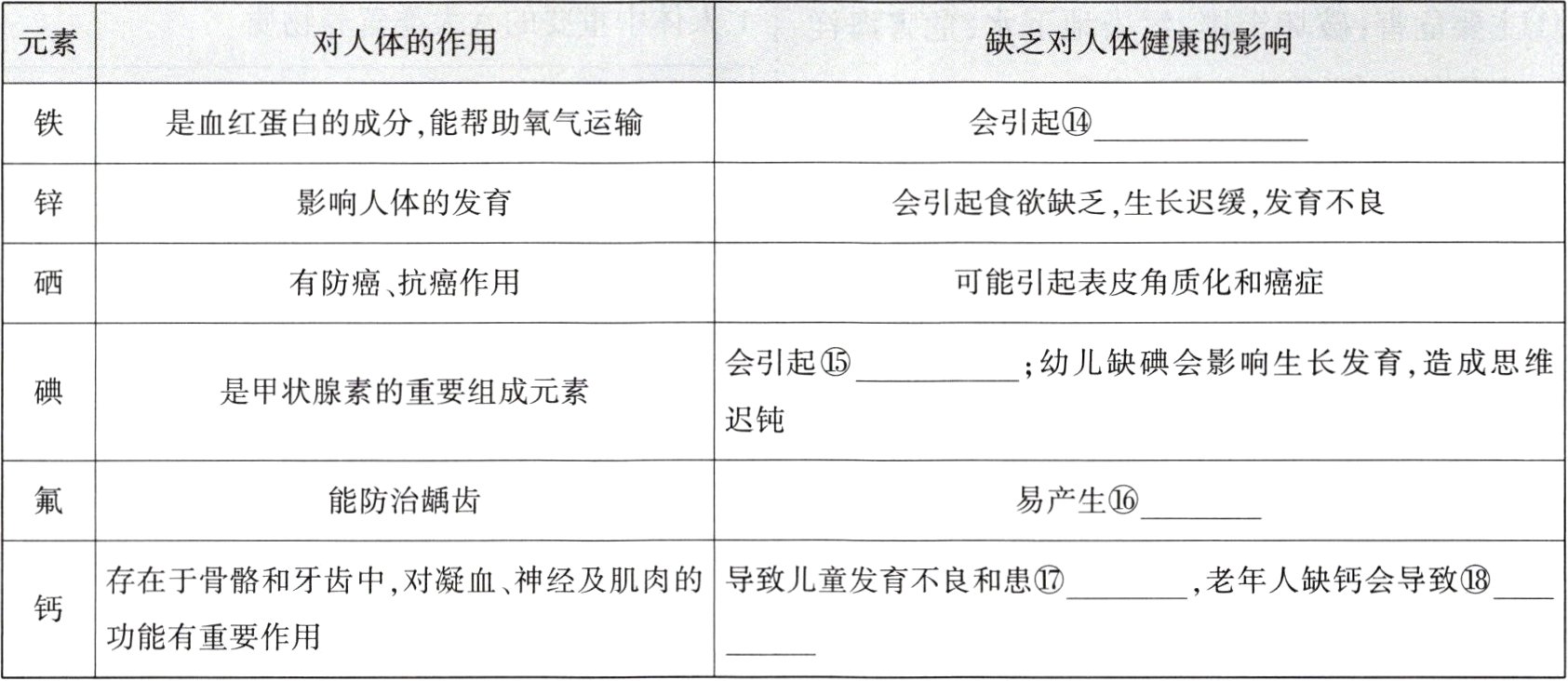 知识4 ⑬C、H、O ⑭缺铁性贫血 ⑮甲状腺肿大 ⑯龋齿 ⑰佝偻病 ⑱骨质疏松 ⑲砷 ⑳血红蛋白 ㉑变性 ㉒双目失明