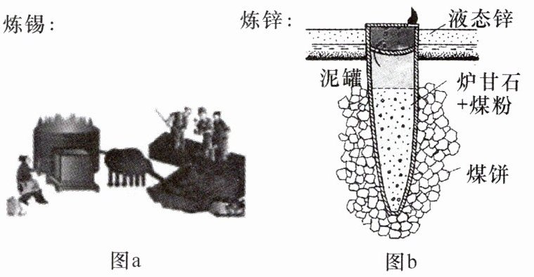 。(2)图b为古代炼锌工艺原理示意图。炉甘石主要成分是${ZnCO_{3}}$,高温易分解生成${ZnO}$。