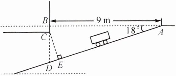 10.解:$\because\angle ABC=90^{\circ}$,$\angle BAD=18^{\circ}$,$\therefore\angle ADB=72^{\circ}$.在$Rt\triangle ABD$中,$AB=9\ m$,$\tan\angle BAD=\frac{BD}{AB}$,$\therefore BD=AB\cdot\tan\angle BAD\approx9×0.32=2.88(m)$.$\therefore CD=BD-BC=2.38\ m$.在$Rt\triangle CDE$中,$\sin\angle ADB=\frac{CE}{CD}$,$\therefore CE=CD\cdot\sin\angle ADB\approx2.38×0.95=2.261(m)$.结合实际情况,最终结果不得大于2.261m,$\therefore CE\approx2.2\ m$.答:CE的高度约为2.2m.