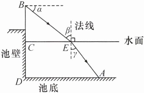 11. (2024·安徽)科技社团选择学校游泳池进行一次光的折射实验,如图,光线自点 $ B $ 处发出,经水面点 $ E $ 折射到池底点 $ A $ 处. 已知 $ BE $ 与水平线的夹角 $ \alpha = 36.9^{\circ} $,点 $ B $ 到水面的距离 $ BC = 1.20 m $,点 $ A $ 处水深为 $ 1.20 m $,到池壁的水平距离 $ AD = 2.50 m $. 点 $ B $,$ C $,$ D $ 在同一条竖直线上,所有点都在同一竖直平面内. 记入射角为 $ \beta $,折射角为 $ \gamma $,求 $ \frac{\sin \beta}{\sin \gamma} $ 的值(结果精确到 $ 0.1 $,参考数据:$ \sin 36.9^{\circ} \approx 0.60 $,$ \cos 36.9^{\circ} \approx 0.80 $,$ \tan 36.9^{\circ} \approx 0.75 $)