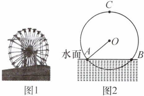4.(2019·安徽 T19·10 分)筒车是我国古代发明的一种水利灌溉工具.如图 1,明朝科学家徐光启在《农政全书》中用图画描绘了筒车的工作原理.如图 2,筒车盛水桶的运行轨道是以轴心$O$为圆心的圆.已知圆心在水面上方,且圆被水面截得的弦$AB$长为 6 米,$∠OAB = 41.3^{\circ}$.若点$C$为运行轨道的最高点($C$,$O$的连线垂直于$AB$),求点$C$到弦$AB$所在直线的距离.(参考数据:$\sin41.3^{\circ}≈0.66$,$\cos41.3^{\circ}≈0.75$,$\tan41.3^{\circ}≈0.88$)