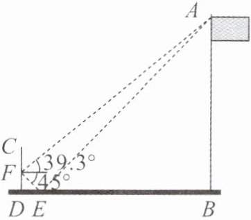 3.(2018·安徽 T19·10 分)为了测量竖直旗杆$AB$的高度,某综合实践小组在地面$D$处竖直放置标杆$CD$,并在地面上水平放置一个平面镜$E$,使得$B$,$E$,$D$在同一水平线上,如图所示.该小组在标杆的点$F$处通过平面镜$E$恰好观测到旗杆顶$A$(此时$∠AEB = ∠FED$),在点$F$处测得旗杆顶$A$的仰角为$39.3^{\circ}$,平面镜$E$的俯角为$45^{\circ}$,$FD = 1.8$米,旗杆$AB$的高度约为多少米?(结果保留整数.参考数据:$\tan39.3^{\circ}≈0.82$,$\tan84.3^{\circ}≈10.02$)