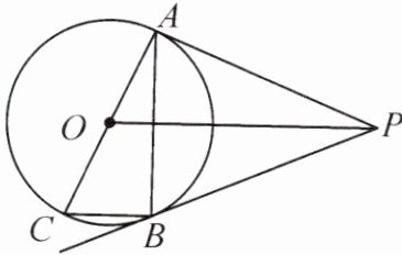 4. (人教9上P101习题T6改编)如图,$ PA $,$ PB $ 是 $ \odot O $ 的切线,$ A $,$ B $ 为切点,$ AC $ 是 $ \odot O $ 的直径。