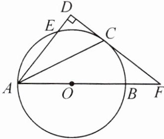 ∵点 C 为$\widehat {EB}$的中点,$\therefore \widehat {EC}=\widehat {BC}$.$\therefore ∠EAC=∠BAC$.$\because OA=OC$,$\therefore ∠BAC=∠OCA$.$\therefore ∠EAC=∠OCA$.$\therefore AE// OC$.$\therefore ∠ADC=∠OCF$.$\because CD⊥AE$,$\therefore ∠ADC=90^{\circ }$.$\therefore ∠OCF=90^{\circ }$.$\therefore OC⊥DF$.又