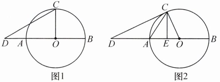 (2) 如图2,若 $ DC $ 与 $ \odot O $ 相切,$ E $ 为 $ OA $ 上一点,且 $ \angle ACD = \angle ACE $。求证:$ CE \perp AB $。
