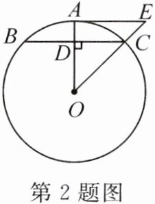2. 如图,$ OA $ 是 $ \odot O $ 的半径,$ BC $ 是 $ \odot O $ 的弦,$ OA \perp BC $ 于点 $ D $,$ AE $ 是 $ \odot O $ 的切线,$ AE $ 交 $ OC $ 的延长线于点 $ E $。若 $ \angle AOC = 45^{\circ} $,$ BC = 2 $,则线段 $ AE $ 的长为