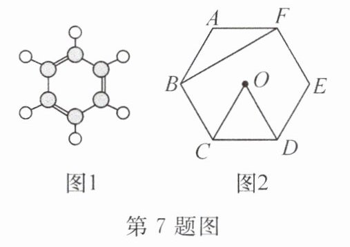 7. (2024·合肥蜀山区二模)苯(分子式为$C_6H_6$)的环状结构是由德国化学家凯库勒提出的。随着研究的不断深入,发现苯分子中的$6$个碳原子组成了一个完美的正六边形(如图1),图2是其平面示意图,点$O$为正六边形$ABCDEF$的中心,则$\angle CBF - \angle COD$的度数为(