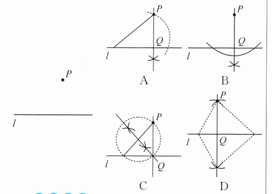 1. 数学活动课上,四位同学围绕作图问题“如图,已知直线 $ l $ 和 $ l $ 外一点 $ P $,用无刻度的直尺和圆规作直线 $ PQ $,使 $ PQ \perp l $ 于点 $ Q $”,分别作出了下列四个图形,则其中作法错误的是(