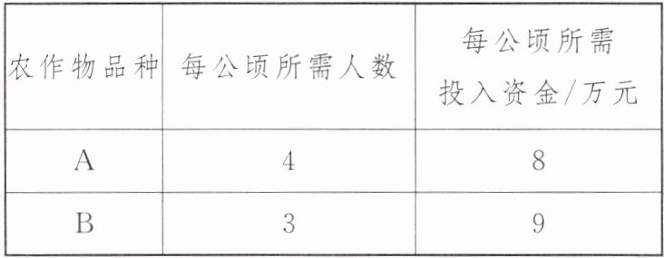 10. (2024·安徽·T17·8分)乡村振兴战略实施以来,很多外出人员返乡创业。某村有部分返乡青年承包了一些田地,采用新技术种植A,B两种农作物。种植这两种农作物每公顷所需人数和投入资金如下表: