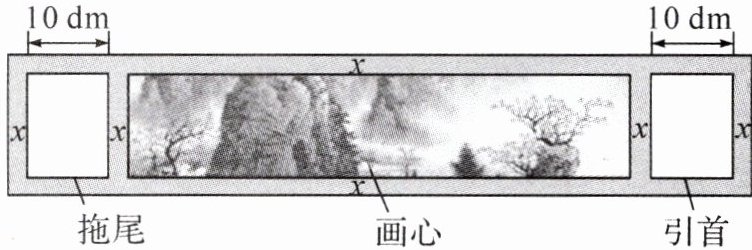 14. (人教9上P22习题T8变式)手卷是国画装裱中横幅的一种体式,以能握在手中顺序展开阅览得名,它主要由“引首”“画心”“拖尾”三部分组成(这三部分的形状都是矩形),分隔这三部分的其余部分统称为“隔水”。如图,墨涵同学装裱了一幅《雀华秋色图》的手卷,手卷长100dm,宽4dm,引首和拖尾完全相同,其宽度都为10dm。若画心的面积为$234dm^{2}$,则隔水的宽度为多少分米?