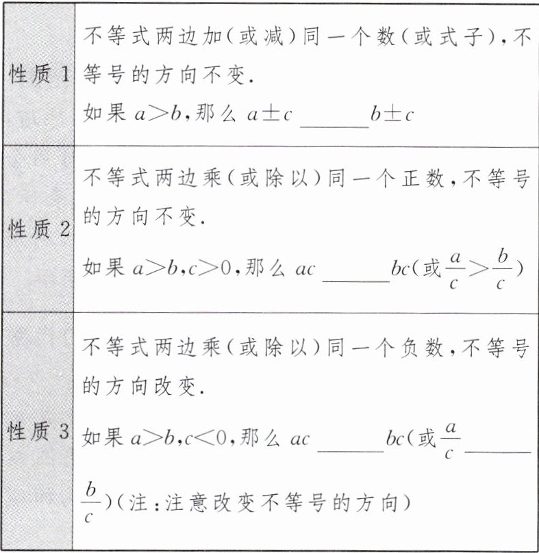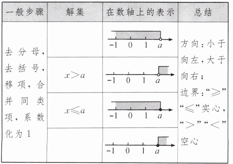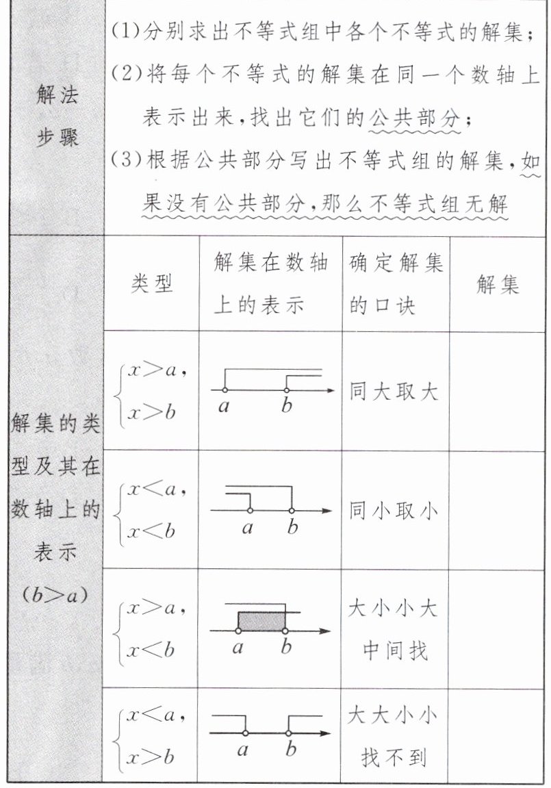 解一元一次不等式解集依次为x < a、x > a、x ≤ a、x ≥ a;不等式组解集依次为x > b、x < a、a < x < b、无解