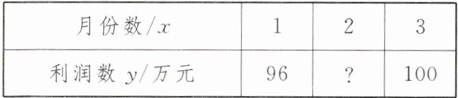 (1)设这个企业在2024年1月至3月的利润数y关于月份数x的函数关系式是$y=kx+b(k≠0)$.将$(1,96),(3,100)$代入$y=kx+b$,得$\left\{\begin{array}{l} k+b=96,\\ 3k+b=100,\end{array}\right. $解得$\left\{\begin{array}{l} k=2,\\ b=94.\end{array}\right. $