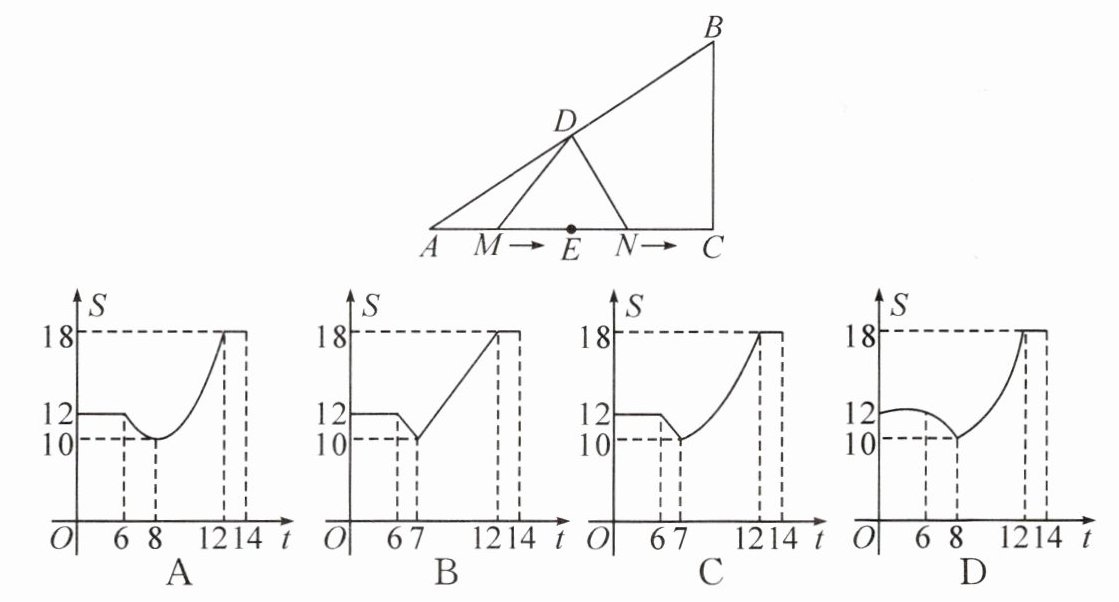 【2024·安徽T10核心考法】如图,在$Rt\triangle ABC$中,$\angle C = 90^{\circ}$,$AC = 12$,$BC = 8$,点$D$和点$E$分别是$AB$和$AC$的中点,点$M$和点$N$分别从点$A$和点$E$出发,沿着$A→C→B$的方向运动,运动速度都是$1$个单位长度/秒,当点$N$到达点$B$时,两点同时停止运动。设$\triangle DMN$的面积为$S$,运动时间为$t$秒,则$S$与$t$之间的函数图象大致为(