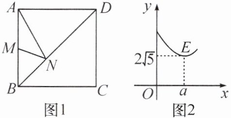 4. 如图1,在正方形$ABCD$中,$M$是$AB$的中点,$N$是对角线$BD$上一动点,设$DN = x$,$AN + MN = y$。已知$y$与$x$之间的函数图象如图2所示,点$E(a,2\sqrt{5})$是图象的最低点,那么$a$的值为(