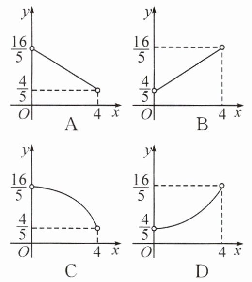 3. (2024·安徽T10·4分)如图,在$Rt\triangle ABC$中,$\angle ABC = 90^{\circ}$,$AB = 4$,$BC = 2$,$BD$是边$AC$上的高,点$E$,$F$分别在边$AB$,$BC$上(不与端点重合),且$DE\perp DF$。设$AE = x$,四边形$DEBF$的面积为$y$,则$y$关于$x$的函数图象为(